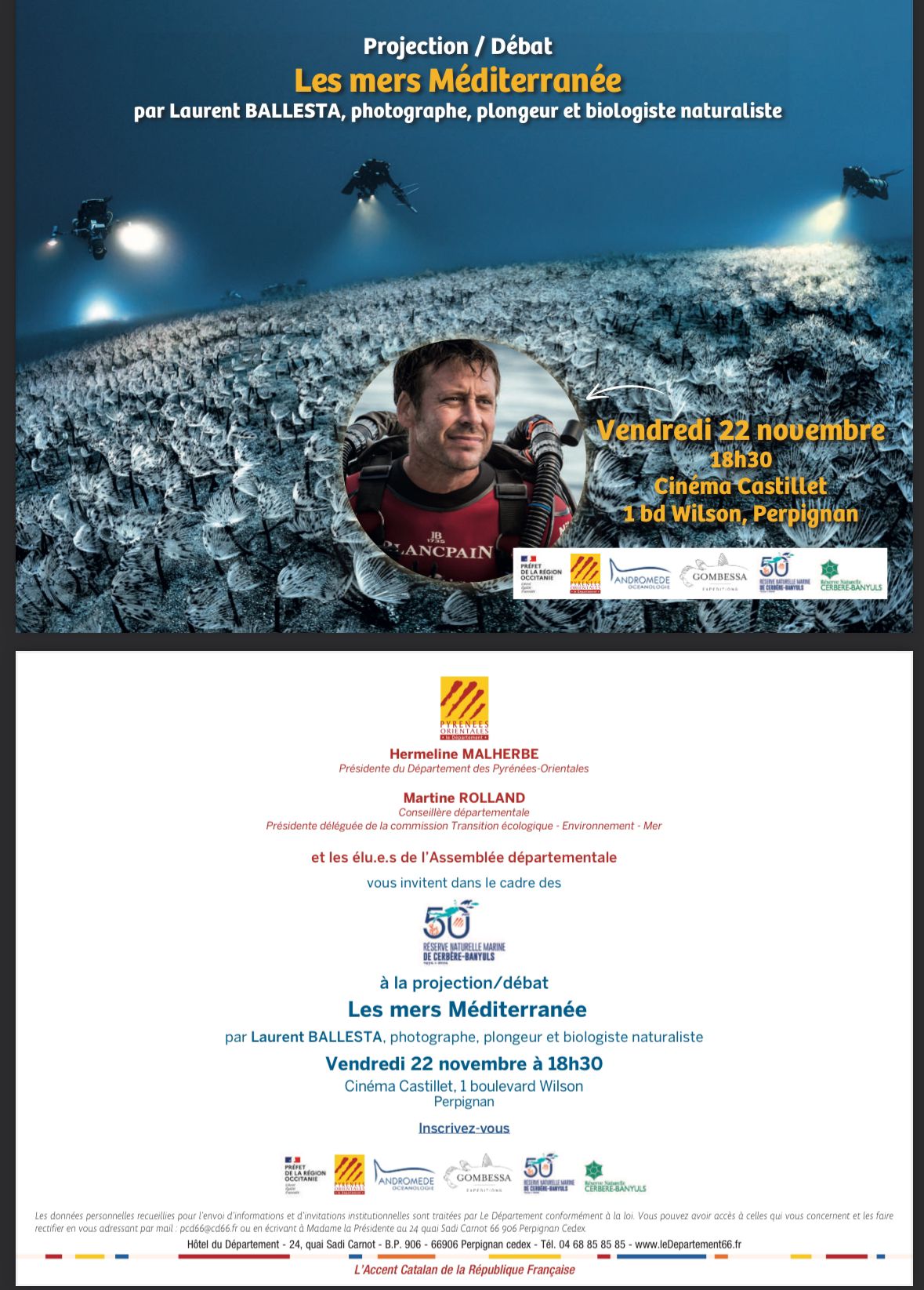 Dans le cadre des 50 ans de la réserve naturelle marine de Cerbère-Banyuls, profitez de la dernière conférence sur ”Les mers Méditerranée” par Laurent Ballesta, photographe, plongeur et biologiste naturaliste. Inscription par email : protocole.ledepartement66@cd66.fr