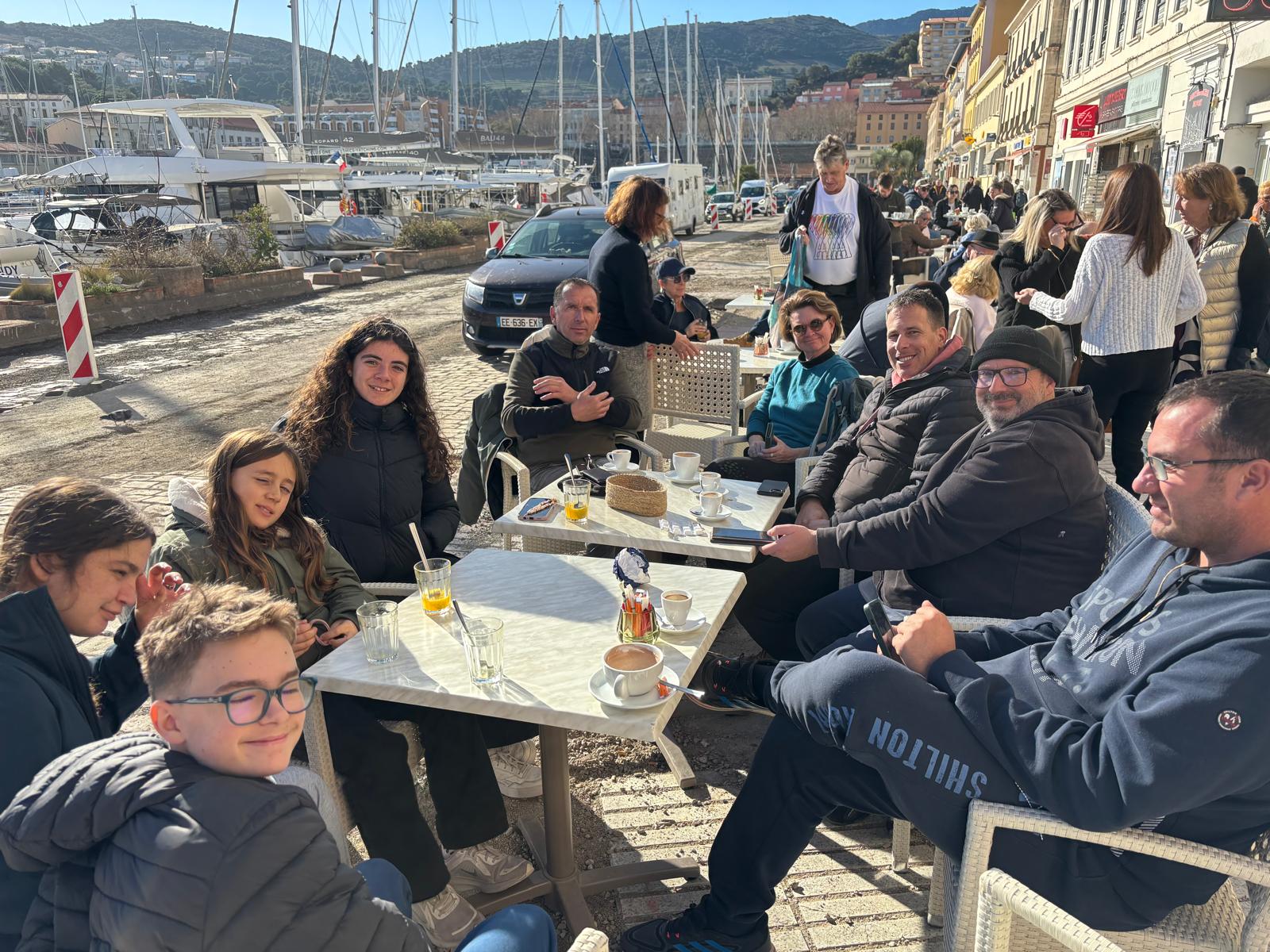 A quai, nous avons repris nos habits de terriens pour prendre un autre genre de collation. Grégoire fêtait l’obtention de son N2. Bravo à lui.